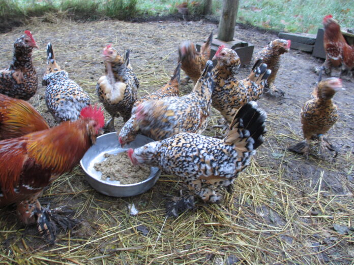 My bantams are Mille Fleurs, so you might expect them to be a French breed but they are really from Holland. They are large for bantams, about half the size of a laying hen. Smaller birds have more trouble keeping warm in the winter and mine stopped laying in the winter, years ago. I looked up the problem and the traditional solution: hot mash.