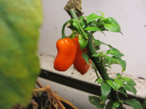 I am also growing peppers, both sweet and the scalding-hot Habanero peppers. Habanero peppers are, on average 76 times hotter than a Jalapeno pepper. I lifted some of the best looking pepper plants out of my polytunnel at the end of the summer and potted them up in large pots. They have the tallest shelves in the Annie Siegel and are still growing. I have to prune their tips back.