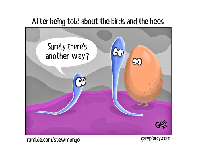 Egg Sperm November 30, 2023 1326 FacebookTwitterPinterestWhatsApp Share this page Check our Gair’s new Book of Toons 2. Available at Abraxas Books AND the Chuckwagon on beautiful Denman Island!