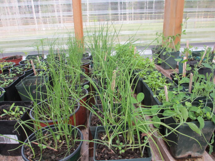 Now, onto the seedlings. My propagation shelves are quite full and my greenhouse tables are filling up with seedlings. I took a friend in to the greenhouse to show her the seedlings and she asked me why I was blowing on them. A seedling in nature feels the wind shaking its stem. This causes the seedling to produce a hormone that strengthens its stem. Without this stimulus, the seedling grows a weak stem and falls over. In commercial greenhouses, I have seen people using fans and even a mechanical device to brush the seedlings.