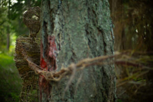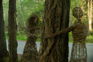 A year later, the trees remain, mostly unscathed, and an extraordinary art installation has taken shape in and around some of these trees, designed and created by an art and activism group called Tree Huggers. Mary Jane Stewart and Joy Brockman began collaborating on sculptures made from branches of a downed weeping willow tree, and from there, Wendy Boothroyd, Lorraine Martinuik, and Cynthia Minden were inspired to create more of these sculptures using basketry willow, maple, bramble, and other prunings. This group was inspired by a similar project in Europe, also named Tree Huggers.