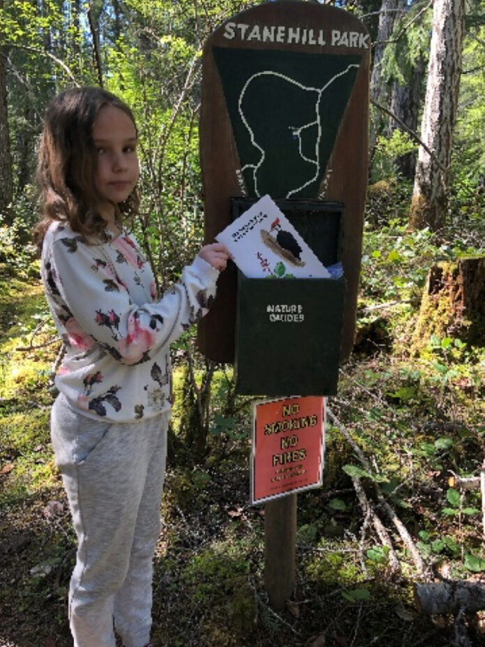 The Stanehill Park is located at the intersection of Greenhill Road and Stanehill Place. The half acre park is owned by the Comox Valley Regional District. It was created in 2012 by volunteers and is primarily maintained by neighbours and the Denman Island Parks Committee of DIRA. The forest has a BC Coastal Douglass-fir habitat. The small size plot lends itself to “interactive” educational walks. To that end a free guide “The Stanehill Park Plant and Bird Guide” is offered to visitors at the North Entry to help you identify typical forest plants and birds in the forest. It shows 78 plant -, 40 bird- and a few mammal drawings. You are welcome to keep it to explore other natural areas on Denman Island. Kids might like to colour the B&W drawings and study our biodiversity at the same time. Why is it called interactive? It has hand-carved, painted birds, mammals and other nature objects dispersed throughout the park for you to find. A nature quiz in a way. The map on the back of the guide marks the location of nature objects with a small “x”, but it does not give away what it is to look for. A winning score means you have found: 1 Barred owl, 1 Anna’s Hummingbird, 1 Red Breasted Sapsucker, 2 Downy Woodpeckers, 1 pileated Woodpecker, 1 Pacific Slope Flycatcher, 2 violet green swallows, 1 Chestnut-backed Chickadee, 1 Red-breasted Nuthatch, 2 wrens, 1 Yellow-rumped Warbler, 2 Purple Finches, 1 American Goldfinch and 1 Racoon, 1 Mink, a cast-off deer antler which has been gnawed on by rodents to seek calcium and a deer foot print next to it, a squirrel midden, a big stump with springboard notches and an erratic. You have to look closely for the squirrel midden with the descaled fir cones on a slog. You will see three types of nest boxes for birds. Nestboxes for cavity nesters: Chickadee, Nuthatch, Woodpeckers, violet-green swallows and wrens etc., a half-open box for flycatchers and a shelf nest for American robins. Robin have learned to build their nest “under cover” to prevent crows and ravens see by them flying over and to rob their bright turquoise eggs. Many nests are made in half-open building or wood sheds. By putting up a shelf support helps them greatly. We have one example in the Park. While the Nature Guides are OK to take with you when you leave the carved critters and other nature object are to remain for enjoyment of visitors who come after you. Though, it must be gratefully emphasized that nobody has ever taken any objects or damaged them. It can’t be said for the winter storm which toppled some trees; one of them smashed the Nature Guide box which us now repaired. If you see something that needs attention, please contact the Parks Committee or e-mail pkarsten@telus.net. It has been said there are no scheduled events in nature but Stainhill Park guarantees you “wildlife encounters”! Enjoy your visit and the quiz!