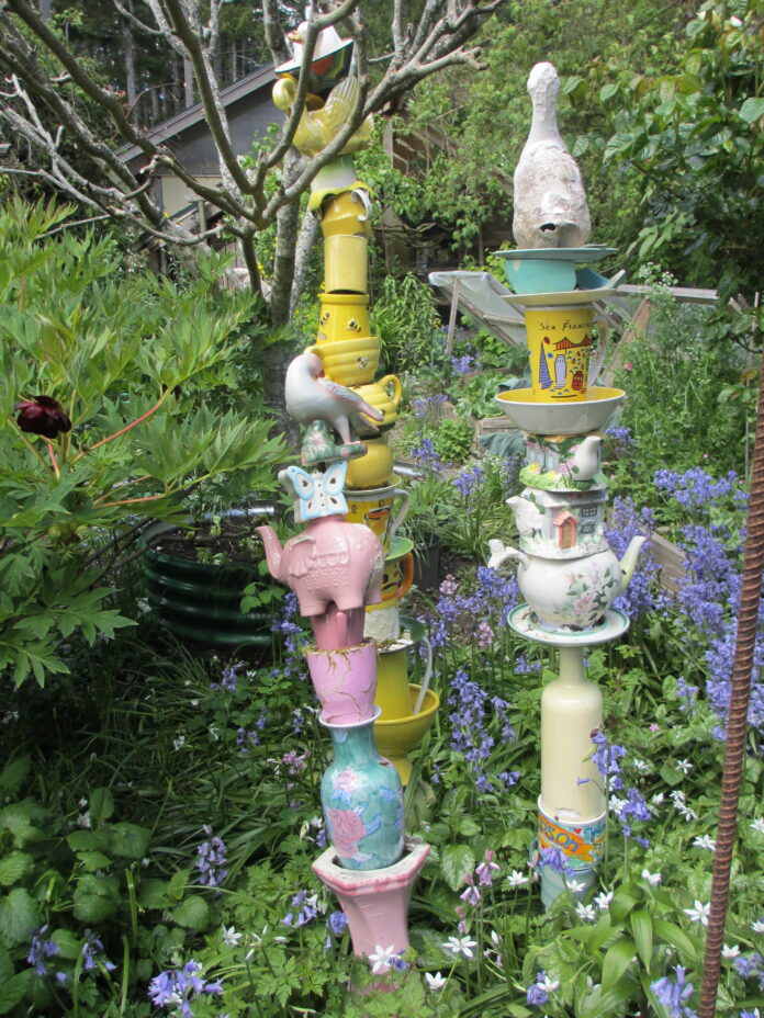 I was expecting a lot of nice plants and they are certainly there but I did not know that Selinda was a ceramicist. She has created enchanting sculptures of ceramic cups, tea pots, piggy banks and so on. They dot the garden and give it the flavour of a Mad Hatter’s tea party. She showed me some of the 200 tiles she made, “to keep my grandkids busy while I was babysitting.” The concrete tiles are inlaid with mosaics of china pieces, metal vases, toys and other oddments in full Mad Hatter style.