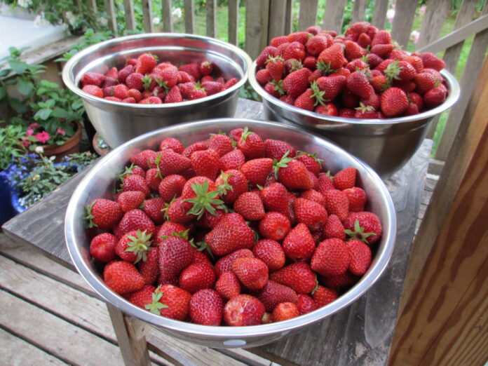 We slide the stainless-steel mixing bowls along the ground and lean over the beds, picking only the ripest berries until the huge bowels are full. The berries are an old-fashioned June bearing variety we have propagated for years. The berries are soft when fully ripe and so juicy. Their flavour would make an atheist believe in the divine. Then comes the slow task of cutting the green tops off and arranging the berries on cookie sheets to be placed in the freezer. The next day, we scoop the frozen berries in ziplock bags and place them, reverently, in the freezers.
