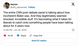 If you were lucky enough to have missed the debate, Biden was so confused and zoned out that not only did CNN’s audience overwhelmingly say Trump won while the word “dementia” was sent trending on Twitter, but it was also uniformly acknowledged to have been a horrifying catastrophe by Democratic Party operatives and liberal media pundits, who are now widely suggesting that the president should withdraw from the race.