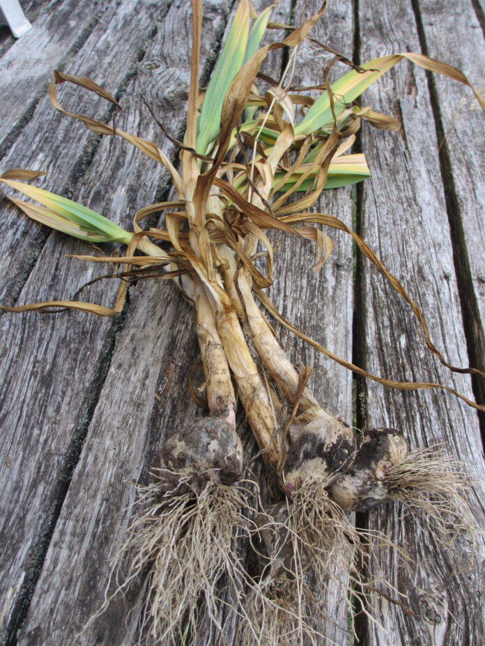When I am cutting off the stems and roots, I look at each crown critically and keep the finest, largest crowns for seed. I only use the largest cloves for planting and my garlic has increased in size over the years. Garlic cloves should be planted in a fresh, well composted bed in late August or early September. They also love a mulch of seaweed which can be harvested responsibly from our many beaches. Just don’t drive on the beaches and don’t take all the seaweed.
