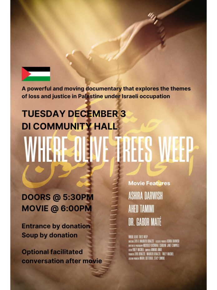 To learn more about the Palestine/Israel conflict, please attend a showing of Where The Olive Trees Weep, at the DI Community Hall, on Tuesday, Dec. 3, soup and bread available, doors open at 5:30 pm. Film begins at 6pm. By donation.