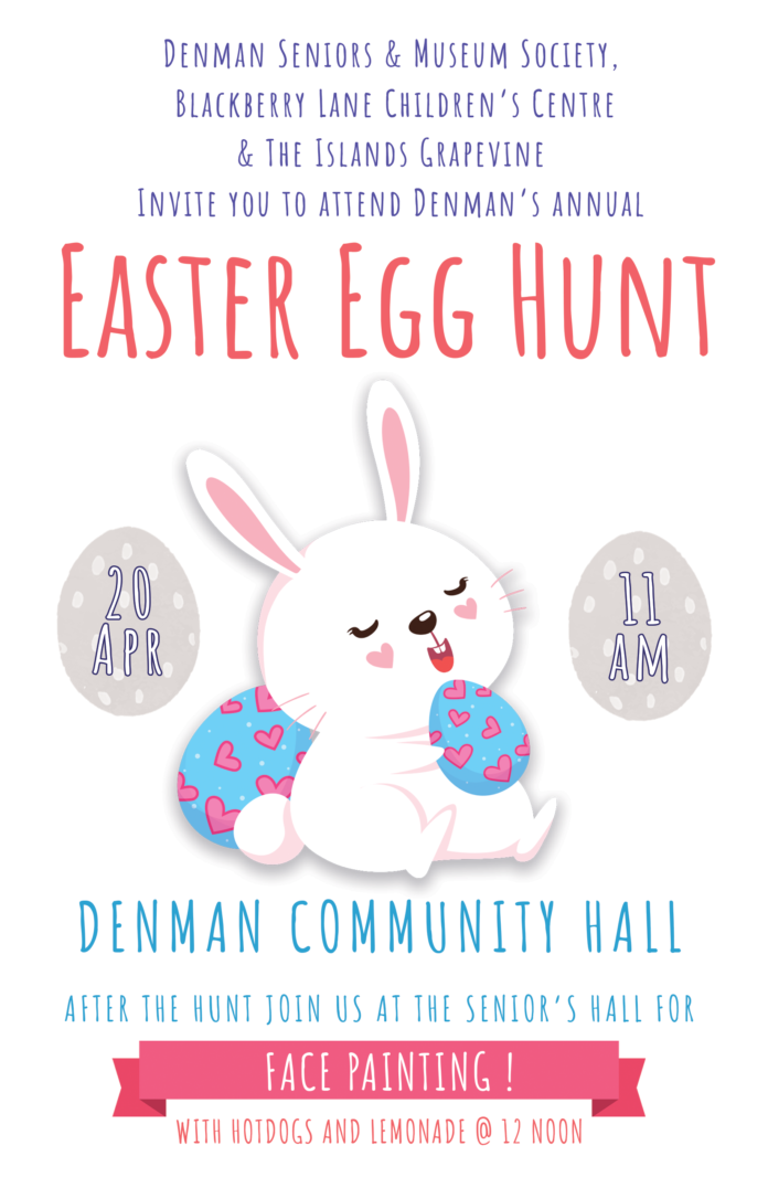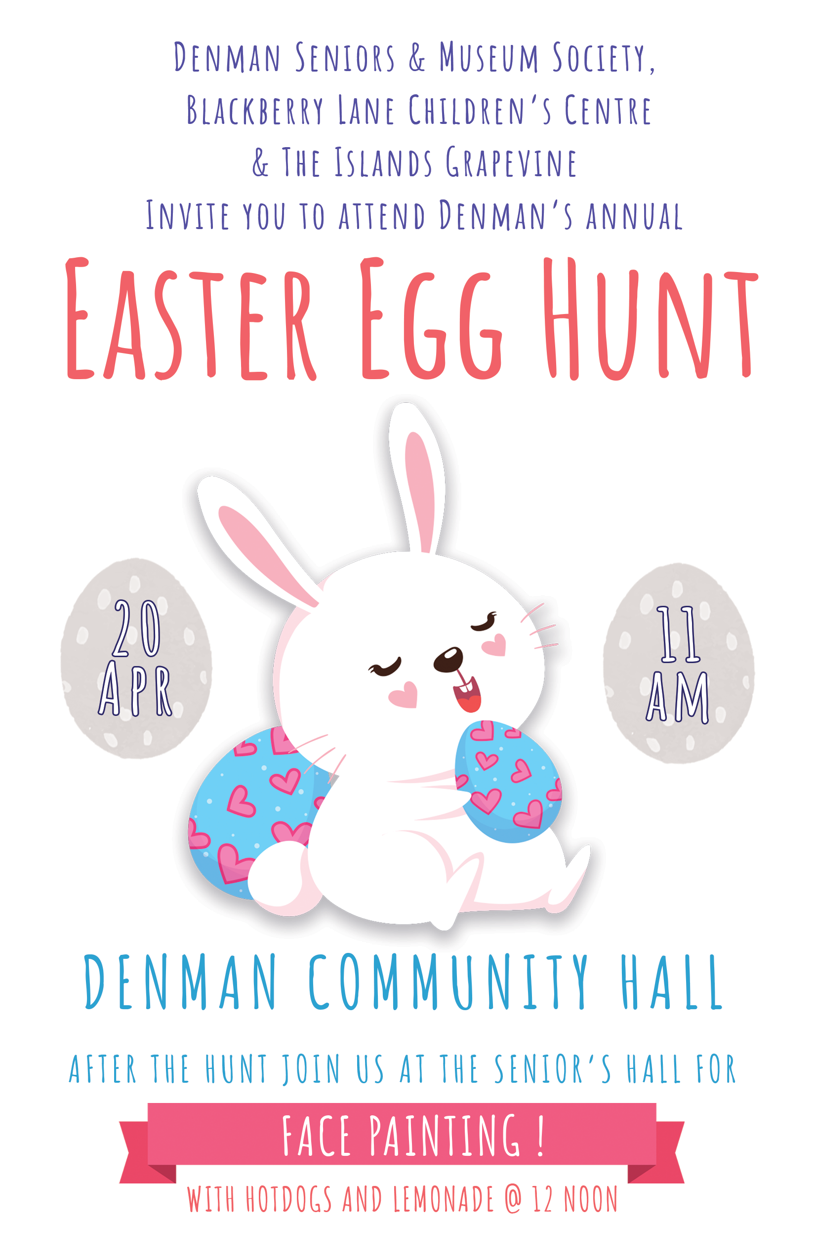 Denman’s Annual Easter Egg Hunt April 17, 2025 869 FacebookTwitterPinterestWhatsApp Share this pageEaster Sunday, April 20th. Hunt begins at 11am sharp! Face Painting Booth! Hot dogs and lemonade after the hunt, 12 Noon at the Senior’s Hall. https://theislandsgrapevine.com/wp-content/uploads/2025/04/Easter-Egg-Hunt-Promo_Happy-Acoustic.mp4