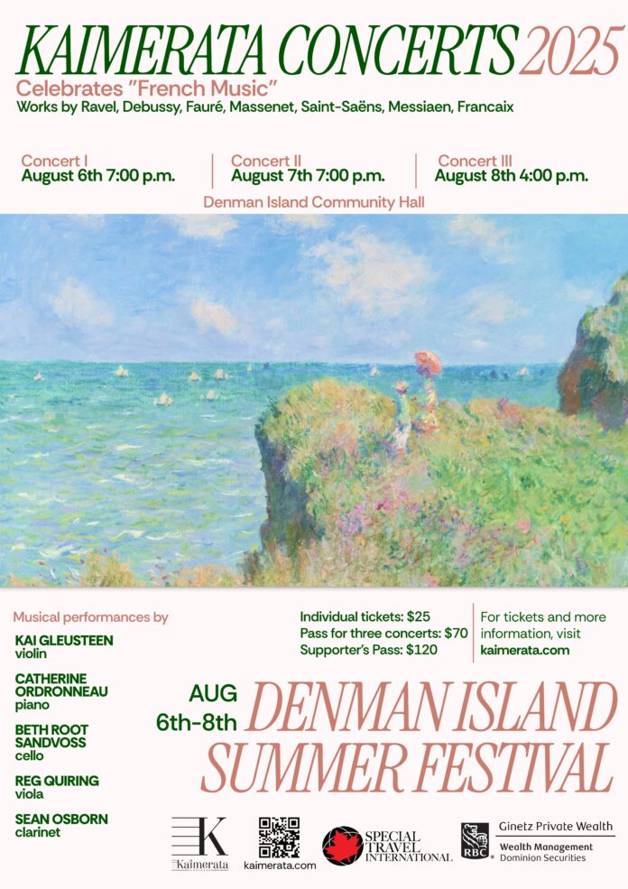 In this year’s edition of the Kaimerata Festival, Canadian violinist Kai Gleusteen and French pianist Catherine Ordronneau are back with a selection of masterpieces from the arguably the most glorious era of classical music in France. The time span is between 1875 and the Second World War. Kai and Catherine will be joined by American/Canadian cellist Beth Root Sandvoss, Canadian violist Reg Quiring and American clarinettist, Sean Osborn. They will perform three different programs August 6th, 7th, and 8th.