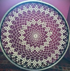 On her many visits to second hand shops, Maureen noticed that doilies, which used to be a treasured part of our grandmothers’ homes, were now in bags selling for just a few cents. “These doilies took an incredible amount of time and skill to make. Many of them are incredible beautiful and so I have tried to repurpose them, honouring the work of our grandmothers. I string them on hoops to make mandalas to hang in windows, and some of them I use as collage in my paintings,” says Maureen.