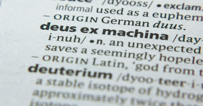 In ancient Greek theater they used to resolve plays by having gods come in at the end to punish the villains and reward the heroes. The actors playing the gods would either be lowered onto the stage by a crane or raised by machine from a trap door below, hence the term deus ex machina. Today it’s used to refer to any lazy plot resolution where the protagonists are rescued out of the blue by an external force rather than by the fruit of their own struggles and character development; if the gods just come in to save them at the end, then nothing they did up until that point mattered, leaving the audience dissatisfied and staring at the writer instead of at the story.