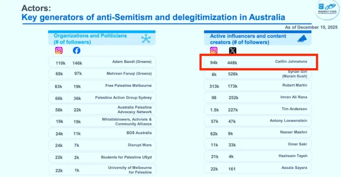 Page five of the document is titled “Actors: Key generators of anti-Semitism and delegitimization in Australia,” where the name Caitlin Johnstone is listed at the top of a column titled “Active influencers and content creators” which is ranked by number of followers. Page seven describes me as an “Anti-Western blogger, promoting conspiracies and complete delegitimization of Israel.”