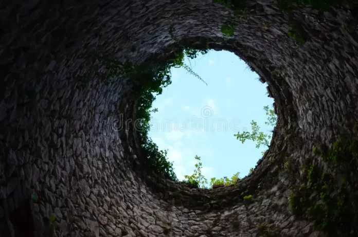 The view from the bottom of a well? Uncomfortable. A dull grey tube ending in a circle of azure sky. Dry at the moment, but the mind could picture it filled with water which would steal warmth from anyone trying to exit this tomb either floating or scaling the featureless walls. Shiver.