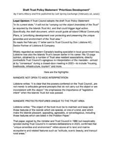 Today’s insert by Salt Spring Island journalist, Frants Attorp (see below) is alarming for those of us who live in the Gulf Islands and have embraced the mandate of the Islands Trust “to preserve and protect the trust area and its unique amenities and environment for the benefit of the residents of the Trust Area and of British Columbia generally ,,,” Most often expressed as the “Preserve and Protect” mandate. Over the course of the past 10 or so years it has been evident that some Trustees, primarily those elected in the southern gulf islands have sought to reinterpret and or circumvent regulations in favour of growth and development. For many of us on the more northern islands the legal opinion quoted in the insert creates some hope that this trend will come to an end and, with public support of trustees from northern islands, and progressive trustees from throughout the Trust Area the “preserve and protect” mandate will be reinvigorated.