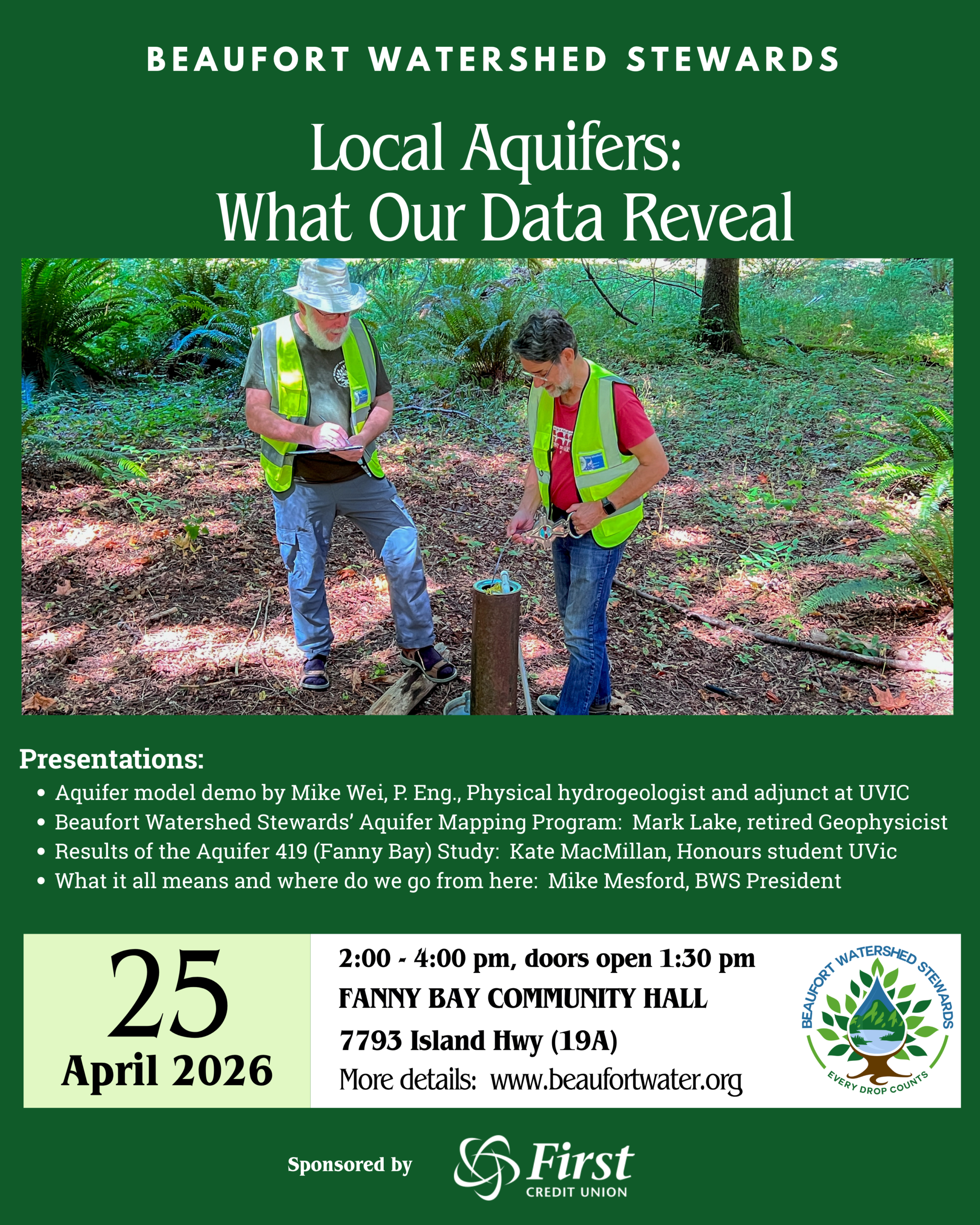 The Beaufort Watershed Stewards (BWS) is pleased to present a town hall to discuss “Local aquifers: What Our Data Reveal.” On Vancouver Island, aquifers provide over 70% of drinking water. As with much of BC, our local aquifers are poorly characterized due to their small size, complex geology, and limited funding for study. This leaves many communities without essential information about their only water source. Our hope is that this town hall will give a ‘deeper’ understanding of local groundwater basics.